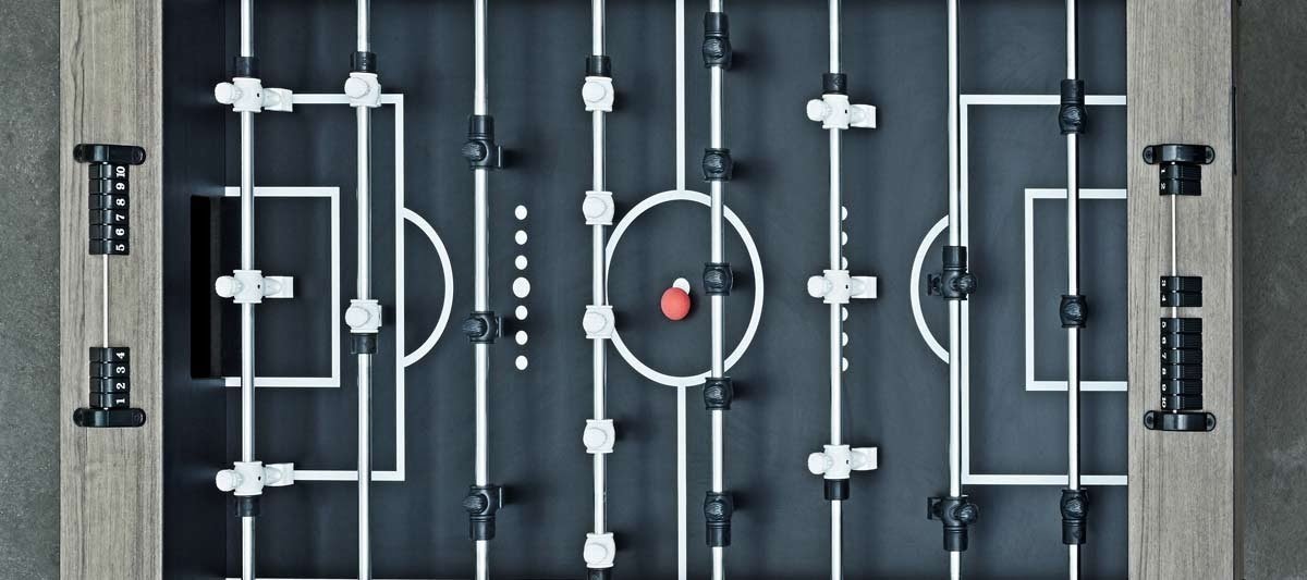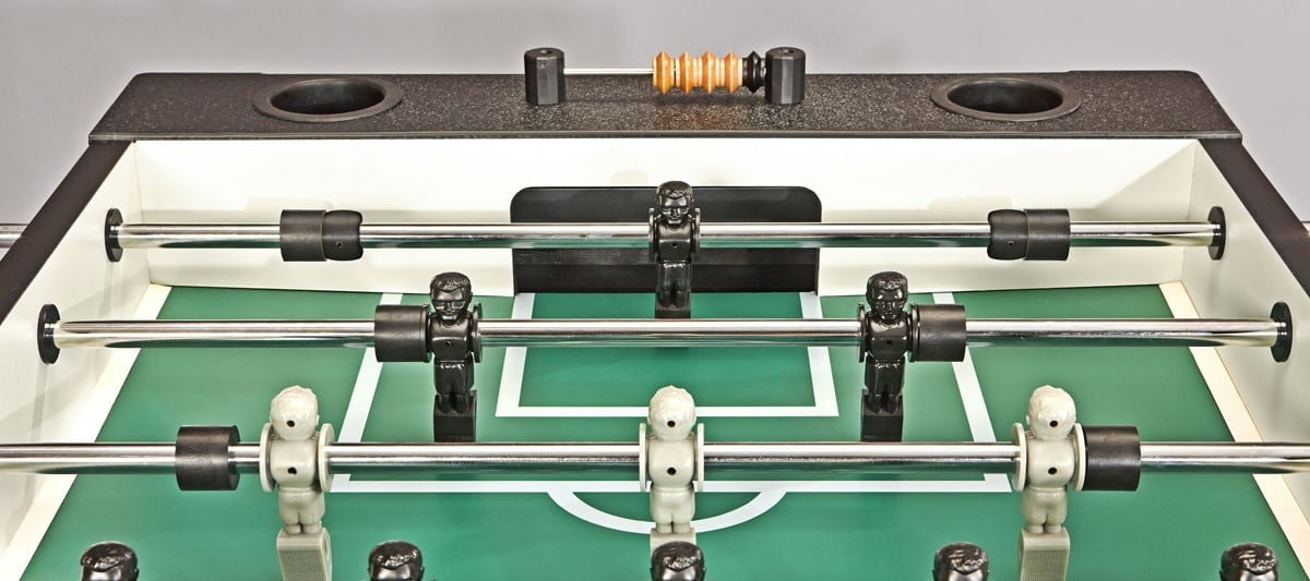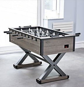 Sturdy vinyl cabinet and melamine play surface 3-man goalie for fast play Unique metal “X” frame base for increased stability